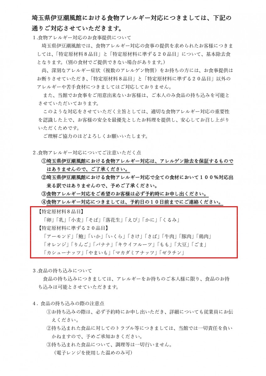 埼玉県伊豆潮風館における食物アレルギー対応について
